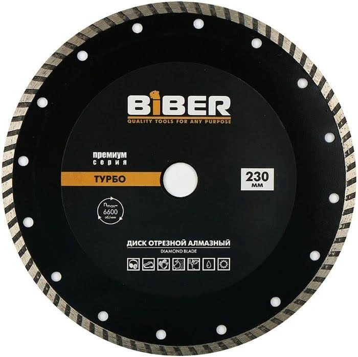 БИБЕР 70256 Диск алмазный турбо Премиум 230мм (10/50) Диски Турбо дают более чистый срез, чем сегментные, но имеют менее высокую производительность, так как нуждаются в перерывах в работе для исключения перегрева. Диски премиум отличаются особенными свойствами режущей кромки (за счет повышенной концентрации алмазов), что увеличивает их производительность и долговечность. Важно помнить, что при работе с алмазным диском следует соблюдать меры безопасности по охране труда. Пользуйтесь защитным кожухом на электроинструменте, не забывайте надевать перчатки, защитную маску и наушники. Назначение: Предназначен для резки бетона, кирпича, керамогранита, гранита, мрамора и другого природного и искусственного камня. Используется с углошлифовальными машинами, электрическими плиткорезами и штроборезами. Для работ с высокими требованиями к качеству среза.