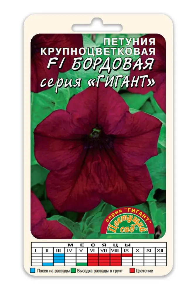 Петуния крупноцветковая F1 БОРДОВАЯ серия «Гигант» Новый крупноцветковый гибрид. Растение компактное, высотой не более 15–25 см, усыпанное крупными, оригинально окрашенными цветками, достигающими в диаметре 10–12 см. Петуния идеально подходит для групповых посадок, балконных ящиков, вазонов и цветочных горшков. Она неприхотлива, отлично чувствует себя даже в условиях большого города и будет радовать Вас пышным цветением весь сезон. Агротехника Выращивается рассадным способом, семена при этом лишь слегка присыпают легким грунтом или производят посев под стекло. В грунт рассаду высаживают, когда минует угроза заморозков. Петуния предпочитает богатую питательными веществами супесчаную почву на солнечном месте. Полив умеренный, так как петуния не переносит переувлажнения. При выращивании рассадой для получения хорошего результата по всхожести и росту рассады, применяйте торфяные таблетки. *Дизайн упаковки может быть изменён.