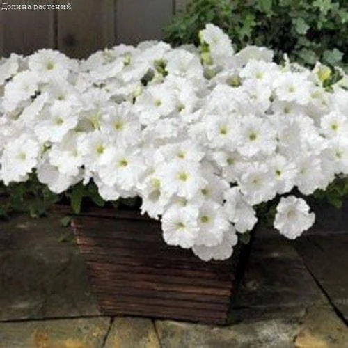 Необыкновенно красивое растение c повисающими побегами длиной до 80 см. Молодые кустики прямостоячие, вырастая, побеги свешиваются и образуют настоящую лавину из крупных белых цветков 7-10 см в диаметре. Выращивают рассадным способом. Посев проводят с января по апрель, поверхностно, под стекло (после появления всходов стекло убирают). В зимние месяцы (январь-февраль) досветка обязательна. При ранних сроках посева цветение начинается в мае, что очень удобно для выращивания растений на балконе, закрытых террасах, патио. Без дополнительного освещения петунию высевают не раньше марта. Всходы появляются через 7-12 дней. На постоянное место высаживают, когда минует опасность заморозков. Светолюбива и достаточно засухоустойчива. Предпочитает легкие, плодородные, хорошо дренированные почвы. Петунии можно выращивать в течение нескольких лет, сохраняя зимой в освещенном помещении (растение сильно обрезают, t не более 12°C, умеренный полив). Прекрасно смотрятся отдельные растения петунии, высаженные в группе образуют яркое, нарядное пятно, великолепно украсят балконные ящики, вазы и подвесные кашпо.