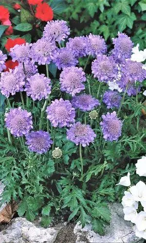 Великолепные цветы для букета. Стебли прямые, ветвистые, 80 см высотой. Цветёт крупными махровыми цветками, диаметром 5 см. Их окраска - нежно-сиреневая с фиолетовыми акцентами и белыми бликами. Цветоносы высокие, крепкие, устойчивые. Скабиоза отличается невероятными
