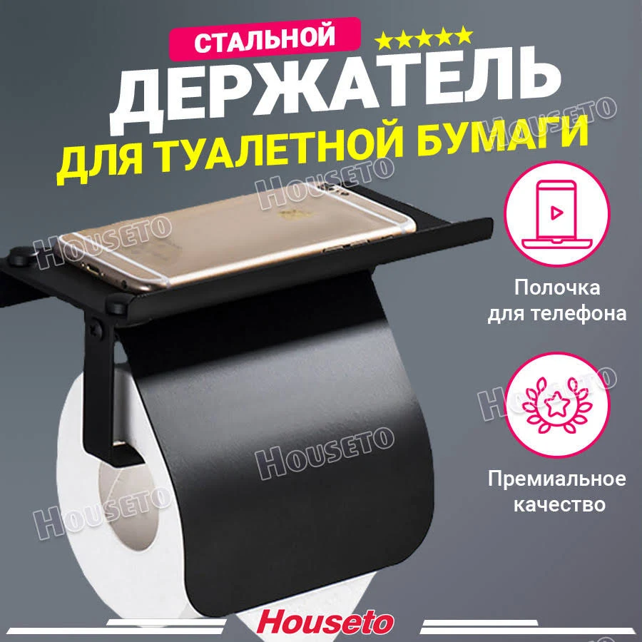 Держатель для туалетной бумаги выполнен из стали, окрашен в черный цвет. Отличный вариант для современной уборной. Купите держатель для туалетной бумаги – создайте удобства для ежедневного посещения туалетной комнаты. Конструкция изделия добротная, прочная. Покрытие специальное - черное. Благодаря этому бумагодержатель стоек к коррозии даже при установке в помещениях с повышенным уровнем влажности. Черная расцветка в купе с дизайном превращают держатель в стильный, современный гаджет. Сверху изделия расположена небольшая полочка. На ней разместятся небольшие предметы: освежитель воздуха, влажные салфетки, телефон. Это очень удобно и практично, можно даже смотреть видео на смартфоне. Держатель для бумаги крепится настенным способом на два болта. В комплект поставки входят по два дюбеля, самореза и заклепки в цвет изделия. Если стены выложены из плитки, то можно приклеить держатель при помощи специального клея. Товар нужно приобрести в дом, если вы только купили квартиру, сделали ремонт в туалете или совмещенном санузле, вышел из строя старый бумагодержатель или просто решили обновить аксессуар. С данным гаджетом в туалетной комнате все будет лежать и висеть на своих местах, в зоне досягаемости, как комфортно вам.