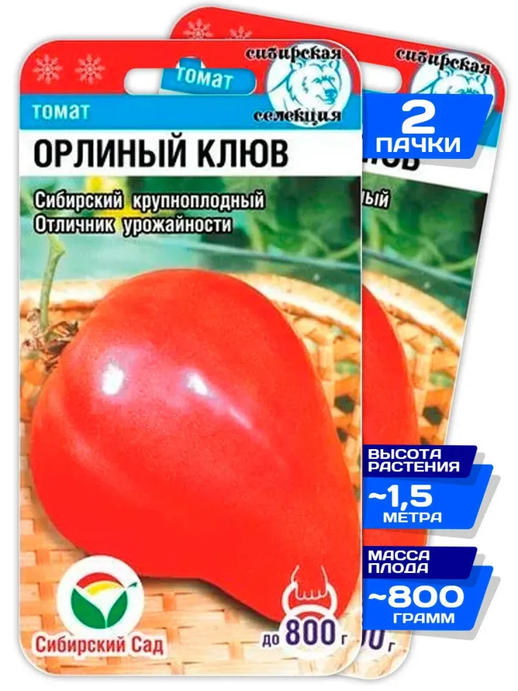 Среднеспелый сорт сибирских селекционеров с крупными плодами весом до 800 г необычной клювовидной формы. Рекомендуется для выращивания в открытом и защищенном грунте. Растение среднерослое, в зависимости от условий выращивания высотой от 1,2 до 1,5 м, требует подвязки и умеренного пасынкования. Плоды малиново-розового цвета, вкусные, формой напоминают мощный изогнутый клюв орла. Мякоть малосеменная и очень плотная, что обеспечивает хорошую лежкость и высокие засолочные качества плодов. По урожайности (до 6-8 кг с растения) данный сорт можно назвать одним из лучших среди крупноплодных томатов. В первой фазе плодоношения плоды особо крупные, весом до 800 г, последующие средние, массой 200-400 г.
