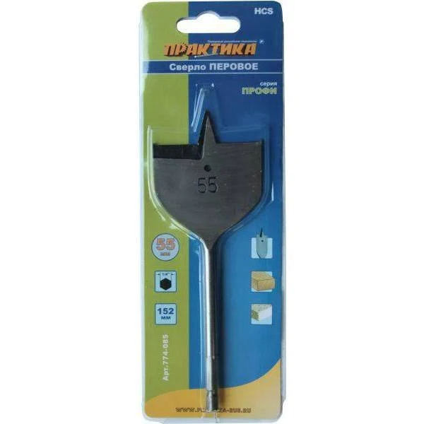 Сверло изготовлено из высококачественной углеродистой инструментальной стали У10А. Шестигранный хвостовик 1/4"" может использоваться со стандартными магнитными держателями для бит, это позволяет быстро менять оснастку. Хорошо фиксируется в кулачковом патроне без проскальзывания. Сверло имеет боковую подрезку для чистого сверления неглубоких и сквозных отверстий в мягкой и средней твердости древесине. Высокая скорость сверления. Допустима перезаточка. В случае нехватке длинны сверла возможно использование удлинителя, при этом необходимо выемка стружки из отверстия. Диаметр 55 Длина общая 152 Тип свёрл по дереву перовое"