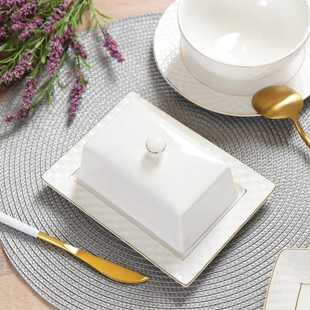 Масленка из коллекции ""Кембридж"" идеально впишется в интерьер любой кухни. Благодаря ей масло сохранит свой натуральный вкус и свежесть, оно будет надежно защищено от влияния посторонних запахов и обветривания. Рельефное украшение и золотистая вставка делает ее утонченным и изысканным, а потому можно смело рассматривать ее в качестве практичного и изысканного презента. Не рекомендуется мыть в посудомоечной машине и чистить абразивными средствами во избежание истирания золотистого ободка. Материал: керамика. Размер изделия: 18х13.5х5.5 см."