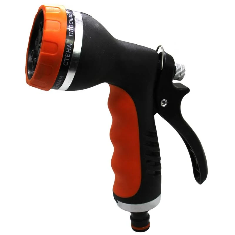 Пистолет металлический многофункциональный крепится на конце садового шланга и служит для превращения водяной струи из мощного и жесткого напора в различные типы струи в зависимости от желаемого. С помощью пистолета для полива легко визуально отслеживать направление полива и регулировать дозировку воды – для прекращения подачи воды достаточно отпустить спусковой крючок. Обеспечивается плавная регулировка струи от жесткой точечной до мягкого тумана. Регулировка дальности полива Функция беспрерывной подачи воды Подключение к шлангу с помощью коннектора Имеет следующие функции полива: душ, разбрызгивание под углом, полная струя, ливень, конус, плоская струя, центральная струя, аэрозоль