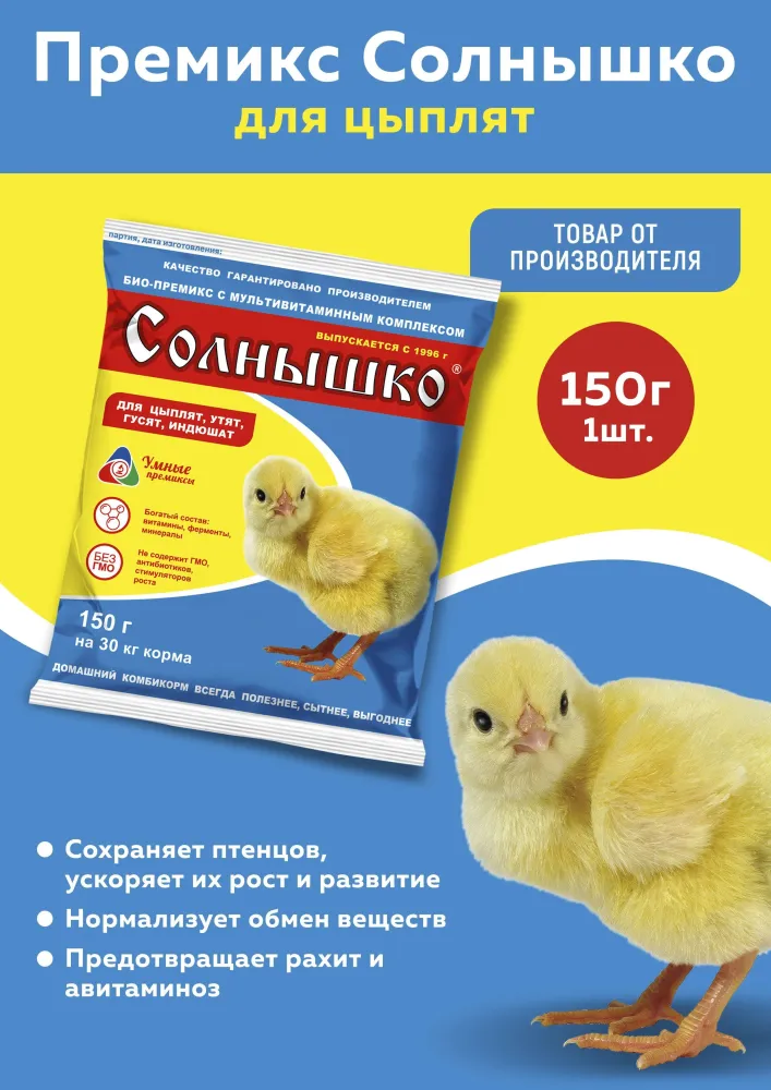 Главная / Каталог / Сад и Огород / Премикс СОЛНЫШКО д/цыплят 150г