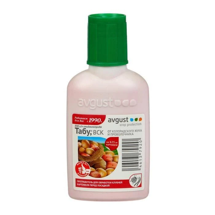 Протравитель картофеля от колорадского жука Табу 50 мл. Табу – современный препарат для защиты картофеля от колорадского жука и проволочника. Первый способ использования препарата Табу - протравливание клубней перед посадкой. Имея в составе специальный цветовой маркер, Табу позволяет равномерно нанести раствор, контролируя объем окрашенных клубней. Табу создает на поверхности посадочного материала прочную окрашенную пленку, неосыпающуюся после высыхания. После высыхания посадочный материал помещают в лунки и прикапывают. Вторым способом использования Табу является опрыскивание борозды или подготовленных под посадку лунок с разложенным картофелем. Обработанные борозды засыпаются землей со следующего ряда. Сразу после посадки почвенная влага частично высвобождает действующее вещество, которое выделяется в окружающую среду, формируя своего рода «защитный экран» вокруг клубня. Растущий побег всасывает его как из материнской картофелины, так и из почвы с помощью корней. Благодаря ярко выраженным системным свойствам, Табу равномерно распределяется по вегетирующим органам растения, обеспечивая их надежную защиту с самого момента посадки. При попытке поедания клубней или ботвы вредители прекращают питаться, теряют двигательную активность и погибают в течение суток. Защита от колорадского жука длится до 45 дней после появления всходов, а от проволочника – в течение всего периода его вредоносности. Препарат обладает высокой эффективностью независимо от погодных условий, в рекомендуемых дозах не токсичен для пчел, дождевых червей, птиц и млекопитающих. Расход Табу очень экономичен: 10 мл препарата хватает на 125 кг картофеля.