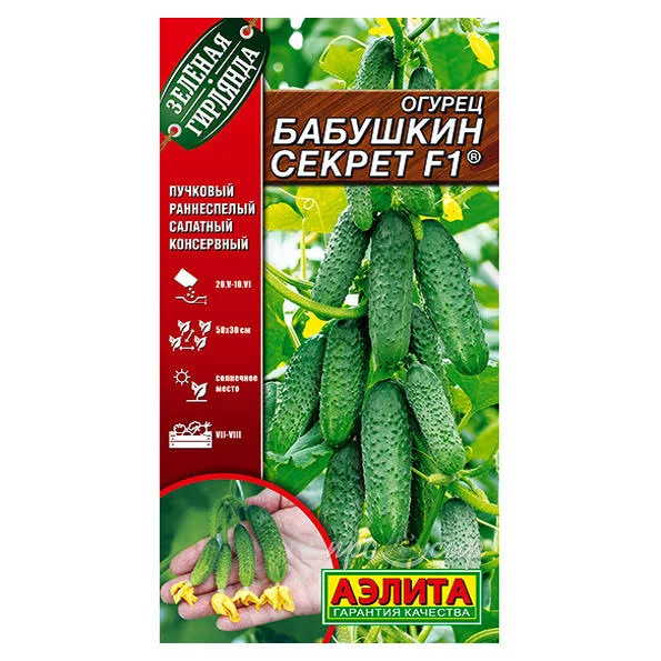 Огурец Бабушкин секрет F1 – раннеспелый партенокарпический гибрид. Плодоносит на 40-43 день после всходов. Закладывает 3-4 завязи в каждом узле. Зеленцы короткие, массой 80-105 г. Никогда не горчат. Гибрид хорошо переносит резкие перепады температуры. Благодаря быстрой и обильной отдаче урожая, отлично подходит даже для северных областей. Можно вырастить 20-25-дневную рассаду. Плотность посадки в теплице 2-3 растения на 1 м2 . Гибрид требует регулярных подкормок. Налив завязей в пучке последовательный, поэтому собирать плоды нужно ежедневно, чтобы питание беспрепятственно поступало к формирующимся плодам. СХЕМА ФОРМИРОВАНИЯ ПАРТЕНОКАРПИЧЕСКИХ ГИБРИДОВ В ТЕПЛИЦЕ (3-4 ЗАВЯЗИ В УЗЛЕ): 0 ЗОНА. в пазухах первых 3-4 листьев выщипывают зачатки побегов и завязей, не трогая самих листьев. 1 ЗОНА. в 3-4 узлах выщипывают зачатки боковых побегов, оставляя завязи. 2 ЗОНА. в 3-4 узлах боковые побеги оставляют, удаляют точку роста после 1-го листа. Все завязи оставляют. 3 ЗОНА. оставляют боковые побеги, ограничивая их рост после 2 листа. 4 ЗОНА. главный стебель несколько раз оборачивают вокруг шпалерной проволоки и прищипывают, когда он достигнет соседнего растения. Все боковые побеги удаляют. Срок созревания: раннеспелый Сортность: партенокарпический гибрид Способ выращивания: открытый грунт, пленочные укрытия Масса плода: 80-105 гр Урожайность: в открытом грунте до 6 кг/м2 Фасовка: 10 шт. Упаковка: цветная, ламинированный пакет Производитель: ООО “Агрофирма Аэлита”