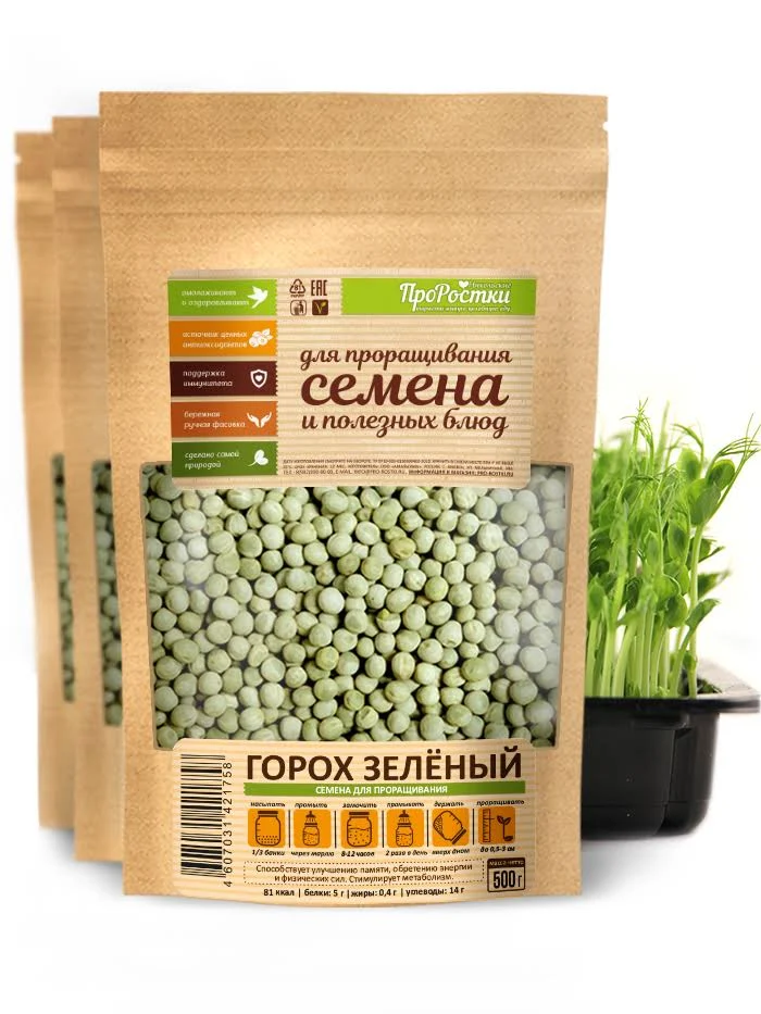 Семена зелёного гороха используют для получения вкусных и полезных проростков, обладающих восстанавливающими, общеукрепляющими и антиоксидантными свойствами. Вкус у проростков гороха очень нежный, напоминает свежий зелёный горошек. Они особенно хорошо сочетаются с овощными салатами, рисом, макаронными изделиями и супами. Зелёный горох очень неприхотливая культура для проращивания. Для получения проростков его замачивают, используя банку с крышкой-сито, либо традиционный тарелочный метод. Проросшие семена гороха способствуют улучшению памяти, обретению энергии и физических сил. Стимулируют метаболизм и повышают иммунитет. Горох в пророщенном виде богат антиоксидантами и ценными питательными веществами, особенно в нём много белка, витаминов (А, B1, В2, РР, С, D, Е, K), кальция, фосфора, железа, калия, магния и йода.