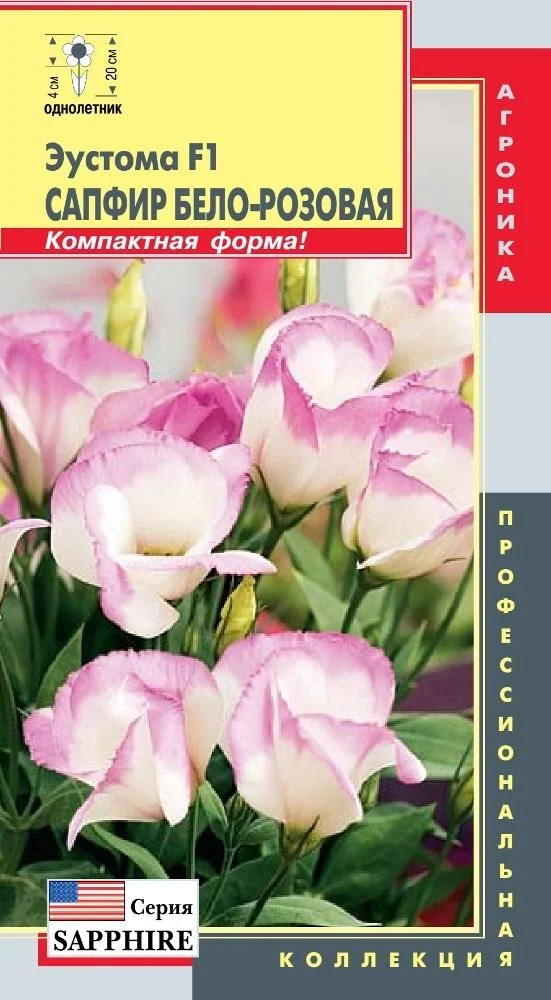Несомненно, это самое модное растение в любом доме. Цветок, который уже покорил сердца самых искушенных цветоводов и флористов всего мира. Серия Sapphire выведена специально для выращивания в горшечной культуре и отличается компактным кустиком (высотой 13-20см и 10-15см в диаметре) и продолжительным периодом цветения. В пиковой фазе цветения, все растение покрыто большим количеством средних по размеру (4-5см в диаметре) соцветий. Цветки белой окраски с розовой каймой по краю. Растение формирует отличную корневую систему, которая помогает ему противостоять различным почвенным бактериям, мешающим нормальному развитию растения. Предпочитает полутень, не переносит сквозняков. ПОСЕВ: Проводят в декабре-мае в зависимости от того – когда вы хотите получить цветущее растение. Субстрат для посева должен быть стерильным, с невысоким содержанием удобрений. Перед посевом, субстрат хорошо проливают. ВНИМАНИЕ! Не допускайте пересыхания субстрата пока не растворилось драже – это приведет к цементированию семени. Сеют поверхностно: семена не присыпают землей, а лишь слегка придавливают к грунту. Ящик с посевами накрывают стеклом. Необходимо обеспечить дополнительное освещение – примерно 40 Вт/м.кв. При Т 16-19°С всходы появятся через 20-25 дней. Высадку в горшок, окончательную емкость для выращивания, проводят в фазе 4-х настоящих листьев через 12-13 недель от посева. В 9-12см горшок высаживают по 4 сеянца. В дальнейшем Т желательно поддерживать на уровне 22-24°С – днем, и 18-20°С – ночью. Плотность расстановки горшков 30-40 горшков/м2, в зависимости от размера горшка. Эустома предпочитает субстрат с высоким содержанием гумуса, возможно в смеси с перлитом. Лучшее значение рН-6-6,5. УХОД: Почва должна быть постоянно увлажненной, ни в коем случае нельзя допускать пересыхания почвы, но при этом поливать следует осторожно, избегая образования постоянной сырости. Подкормки проводят комплексным удобрением в пропорции N:K – 1:2, как правило кальциевой селитрой с добавками микроэлементов. ЦВЕТЕНИЕ: Период от посева до цветения 22-26 недель. Высота:20 см Диаметр:4 см Количество семян:10 гранул