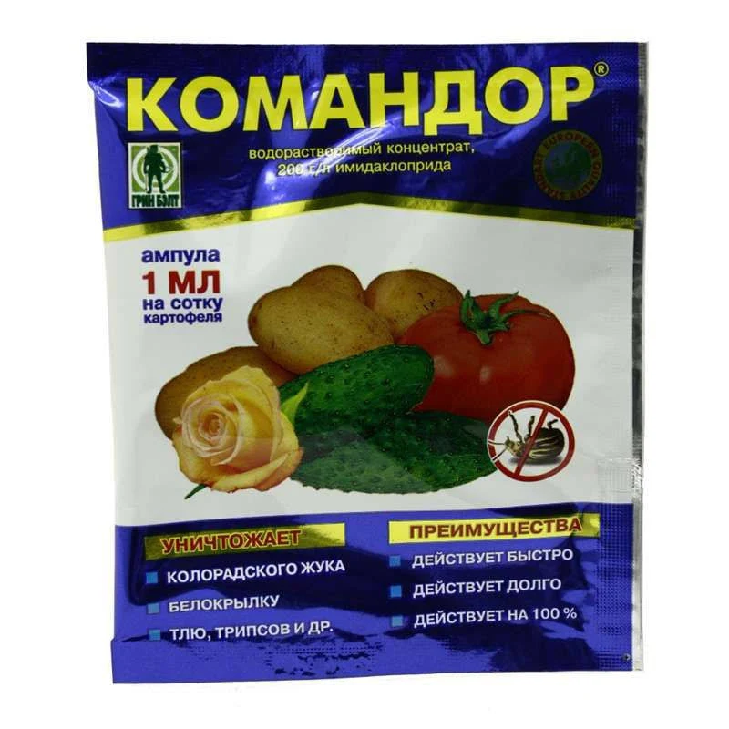 «Командор» — это популярный у садоводов и огородников системный инсектицид, который успешно используется для борьбы с минерами, проволочником, колорадским жуком, трипсами, тлями, двукрылыми вредителями, клопами, листоблошками, белокрылками и другими вредителями. Раствор для обработки растений «Командором» составляют следующим образом: ампулу препарата (1 мл) поначалу разводят в небольшом объеме воды, затем, помешивая, увеличивают объем раствора до 2 — 10 литров. Обрабатывать растения следует в период вегетации. В период цветения препарат следует применять с осторожностью. Важно! Для обработки растений используется только свежий раствор, по возможности равномерно смачивая листья с обеих сторон. Хранить готовый раствор категорически запрещено. При опрыскивании культур необходимо использовать средства индивидуальной защиты. Проводить обработку следует в ясную и безветренную погоду, утром или вечером. Обрабатывать растения «Командором» можно не чаще одного раза в 15 дней. Для борьбы с колорадским жуком на посадках картофеля расходуется 5 литров рабочего раствора на 100 квадратных метров посевов. При борьбе с вредителями на огурцах, томатах, цветочных культурах расходуется 1 литр рабочего раствора на 10 кв. м.. Действие препарата начинается в течение 90 минут. Профилактическую обработку можно провести через 20-30 дней. Кроме того, оправданы дублирующие опрыскивания после дождя – «Командор» может смываться с листьев растений. Препарат не вызывает химического выгорания стеблей и листвы, если рекомендуемая его дозировка не превышена. Сезон применения: весна, лето.