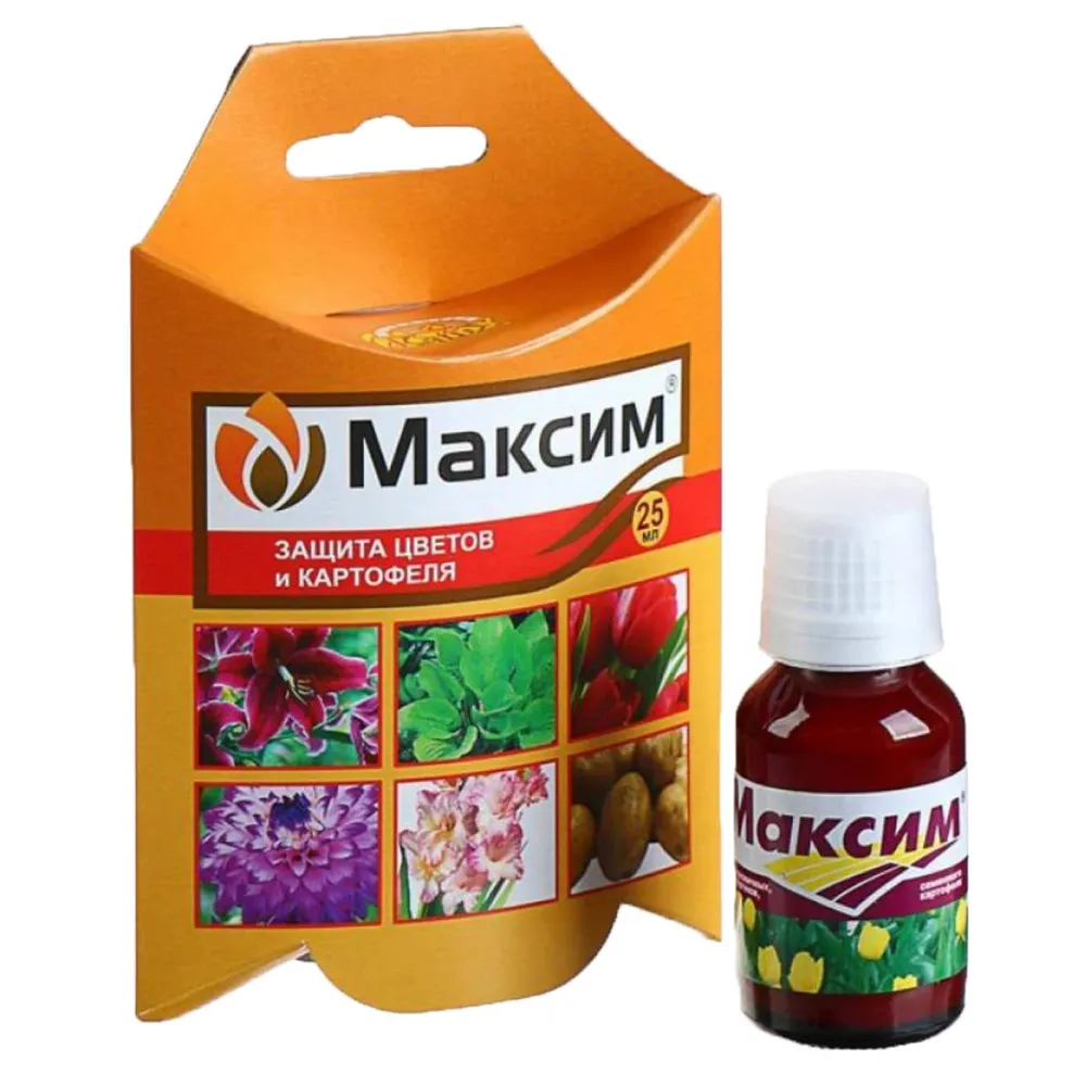 «Максим» — Препарат защитно-контактного действия для защиты от болезней луковичных (тюльпаны, гладиолусы, лилии и т.д.), георгинов, пионов, корней и корневищ других цветов, а также семенного картофеля. Создает защитный барьер на поверхности посадочного материала и в прикорневой зоне в почве. Эффективен против всех видов гнилей, плесеней, фузариоза, ризоктониоза, парши и других заболеваний. Защищает растения от болезней в течение всего периода роста и хранения. Содержит:концентрат суспензии флудиоксонила. Фунгицид. Картофель семенной. Вредный объект: Ризоктониоз, фузариоз. Норма применения препарата: 40 мл/л воды. Обработка клубней перед посадкой. Расход рабочей жидкости—1л/100кг клубней. Картофель семенной. Вредный объект: Гнили при хранении: фузариоз, фомоз, альтернариоз, антракноз, мокрая гниль, парша серебристая. Норма применения препарата: 20 мл/л воды. Обработка клубней перед закладкой на хранение с послед. просушиванием. Расход рабочей жидкости—1 л/100 кг клубней. Цветочные культуры (посадочный материал). Вредный объект:Гельминтоспориоз, фузариоз, пенициллез, ризоктониоз, серая гниль. Норма применения препарата: 2 мл/л воды. Обработка посадочного материала перед посадкой и закладкой на хранение путем погружения в 0,2 %-й рабочий раствор с экспозицией 30мин и послед. просушиванием. Расход рабочей жидкости—1 л /кг.