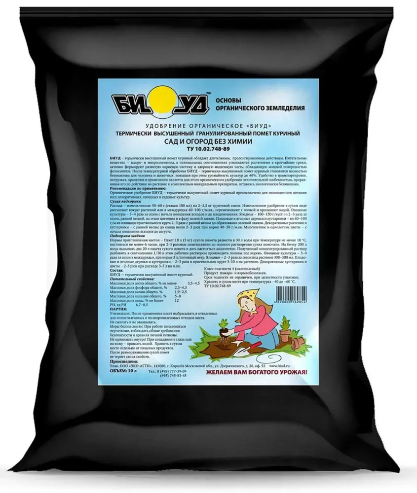 Помет куриный ""БИУД"" - термически высушенный помет куриный обладает длительным, пролонгированный действием. Питательные вещества - макро- н микроэлементы , в оптимальных соотношениях усваиваются растениями в кратчайшие сроки, активно формируют развитую корневую систему и здоровую надземную часть, обладающую мощной поверхностью фотосинтеза. После температурной обработки БИУД - термически высушенный помет куриный становится полностью безопасным для человека и животных, повышая при этом урожайность культур до 40%. Удобство в транспортировке, погрузках, хранении н применении является для этого органического удобрения отличительной особенностью, приравнивая его по действию на растение к комплексным минеральным препаратам, оставаясь экологически безопасным. Рекомендации по применению: Органическое удобрение БИУД - термически высушенный помет куриный предназначено для полноценного питания всех декоративных, овощных и садовых культур. Сухая подкормка Рассада - измельченные 50-60 г. (стакан 100 мл) на 2-2.5 кг грунтовой смеси. Измельченное удобрение в сухом виде рассыпают вокруг растений или в междурядья 60-100 г/м.кв. перемешивают с почвой н проливают водой. Овощные культуры - 3-4 раза за сезон с начала появления всходов и до плодоношения. Ягодные - 100-150 г/куст по 2-3 раза за сезон, ранней весной, на этапе цветения и в фазу зеленой завязи. Плодовые и ягодные деревья и кустарники - по 60-100 г/м.кв площади приствольного круга 2-3 раза с ранней весны до образования зеленой завязи. Декоративные растения и кустарники - с ранней весны до конца июля 2-3 раза при норме 40-50 г /м.кв. Многолетние и однолетние цветы - с начала появления всходов до августа. Подкормка жидкая Нормы приготовления настоя - Пакет 10 л (5 кг) сухого помета развести в 30 л воды при температуре не менее 10 С, настояться не менее 6 часов, при 2-3 разовом помешивании до полного растворения сухих комочков. На бочку 200 л воды высыпать 20 л пакета сухого помета и дать настояться аналогично. Полученный концентрированный раствор разбавить в соотношении 1/10 и этим рабочим раствором производить поливы под корень. Овощные культуры - 3-4 раза за сезон в междурядья, при норме 3 л/погонный метр. Ягодные — 2-3 раза за сезон под растение 300-500 мл. Плодовые и ягодные деревья и кустарники 2-3 раза в приствольном круге 3-1U л на растение. Декоративные кустарники и цветы — 2-3 раза при расходе 3—з л на м.кв. Состав: БИУД — термически высушенный помет куриный. Питательный свойства: Массовая доля азота общего, % не менее 3,5-4,5 Массовая доля фосфора общего, % 2,3-4,3 Массовая доля калия общего, % 1,9-2,5 Массовая доля кальция общего, % 5-8 Массовая доля воды, %не более 12 РН, ед РН 6,7-8,5 Класс опасности 4 (малоопасный) Продукт пожара- и взрывобезопасен. Срок годности не ограничен, при целостности упаковки. Хранить в сухом месте при температурах —40 до +60 °С. ТУ 10.02.748-89 Утилизация: После применения пакет выбрасывать в отведенные для полиэтиленовых и полипропиленовых отходов места. Не сжигать и не закапывать. Меры безопасности: При работе пользоваться перчатками, соблюдать общие требования безопасности и правила личной гигиены. Не принимать внутрь! При попадании в глаза или на кожу промыть водой. Хранить в сухом месте отдельно от пищевых продуктов. После размораживания сухой помет не теряет своих свойств."