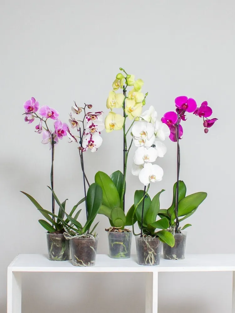 Комплект из 5 орхидей фаленопсис различных сортов (предпочтения по цвету просим указывать в комментариях к заказу) Если вам захочется приобрести для себя набор экзотических цветов необыкновенной красоты, рекомендуем обратить внимание на Фаленопсисы. Декоративное комнатное растение - Орхидея Фаленопсис - неприхотливое цветущее растение, для неё не нужен специальный уход. Фаленопсис будет радовать цветением на протяжении многих недель и месяцев. Комлект орхидей из 5 различных сортов идеально подойдёт для подарка женщине, девушке, жене, дочке, бабушке, маме - на день рождения, Новый Год, день матери, 8 Марта, на новоселье, день учителя и для любых других поводов. Благодаря пышному цветению и великолепному приспосабливанию к комнатным условиям фаленопсис стал наиболее популярным растением из рода орхидей, выращиваемых в помещениях. Крупные цветки оригинальной формы распускаются постепенно от основания кисти, растягивая период цветения на многие месяцы. Цветки орхидеи очень изящны, по форме напоминают бабочку. Именно эта разновидность комнатных орхидей очень неприхотлива к уходу, поэтому будет в радость даже для начинающих цветоводов-любителей. Орхидея Фаленопсис неприхотливая орхидея, для неё не нужен специальный уход. Полив: Опрыскивание листьев, воздушных корней, поверхности грунта мягкой водой комнатной температуры. ДОРОГИЕ ПОКУПАТЕЛИ! Высота растения указана вместе с горшком. Размеры растений и цвет соцветий могут незначительно отличаться. Комплект состоит из разных сортов! По запросу при оформлении заказа добавим информацию с инструкцией по уходу.