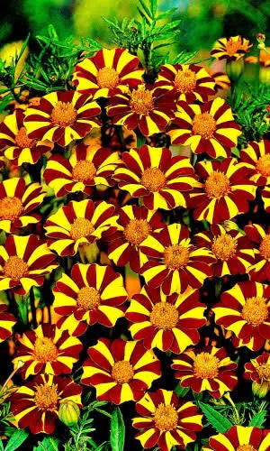 Необычная окраска цветков создает неподражаемый эффект. Куст, высотой до 65 см, сильно ветвистый. Окраска двуцветная: язычковые цветки с красными и оранжево-желтыми полосами. Используют для клумб, рабаток, бордюров.Агротехника. Растение светолюбивое, засухоустойчивое.