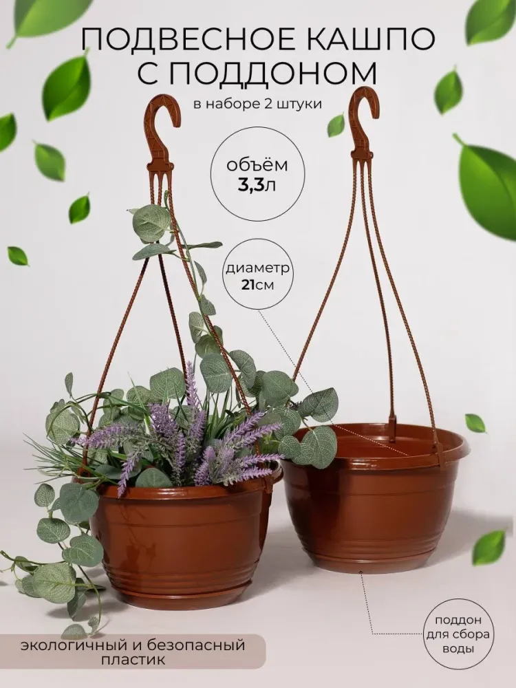 Подвесное кашпо для улицы и дома, цветов. Выпускается на 3,3л, 4,2л и 6л с поддоном и дренажной системой, предназначенный для выращивания комнатных растений, а также петуний, вербены, герани и вьющихся цветов. Стильный дизайн кашпо станет отличным дополнением интерьера. Прекрасно себя ведет в эксплуатации. Набор 2шт.
