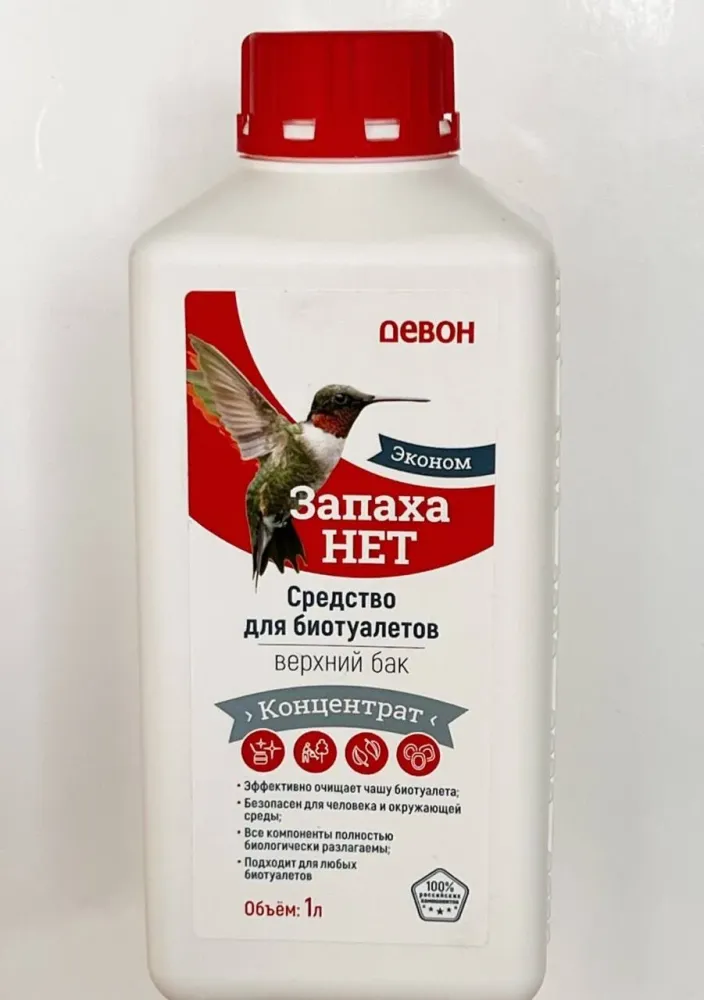 ЗАПАХА НЕТ для верхнего бачка биотуалета сохраняет воду в баке свежей, нейтрализует неприятные запахи, оставляет приятный аромат, образует на туалетной чаше защитную пленку, которая облегчает смыв, предотвращает изменения цвета пластмассы и дезинфицирует поверхность. 100% отечественных компонентов. Экологически безопасно, сливы из биотуалета можно выливать в компост. Состав – водный раствор обычного азотного удобрения, ПАВ, краситель, отдушка. Дозировка - 50 - 100 мл средства на каждые 10 л воды