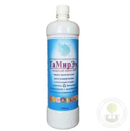 Биологически активный препарат «Тамир» (серии ЭМ) предназначен для утилизации органических отходов. Он применяется в выгребных ямах, для очистки канализационных систем и стоков от жировых отложений и засоров, восстановления дренажа, устранения неприятных запахов, а так же для ускоренной (за 2-3 недели) переработки в высококачественный компост бытовых и сельскохозяйственных отходов (остатков пищи, ботвы, сорняков, опилок, навоза и т.п.).
