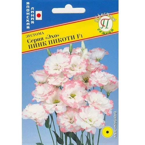 Эустома Пинк Пикоти F1 - раннецветущий гибридный сорт из серии Эхо. Растение отличается крупно-махровыми бутонами, кремовой окраской с нежно-розовой каймой. Хорошо смотрится культура среди групповых композиций на клумбе, рабатках, в вазоне, подходит для срезки в букеты. Как посадить эустому Эхо Пинк Пикоти? Мелкие семена не заделывают в субстрат рассадных ящиков, а рассеивают на поверхности, смешав с песком. После посева ящик накрывают любой прозрачной крышкой, оставляют в теплом светлом месте на 14 дней. Когда появятся сеянцы, растение пикируют в отдельные горшочки, а в середине мая пересаживают в открытый грунт, когда ночная температура будет не ниже +15 С, дневная - +25 С. Покупайте семена эустомы Эхо Пинк Пикоти в нашем магазине. Гарантируем полное сортовое соответствие и оперативную доставку в любой уголок страны.