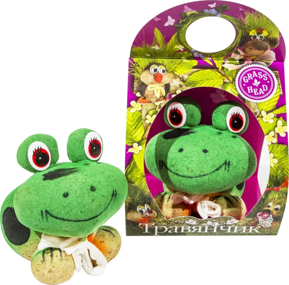 Веселая лягушка, которая в середине зимы обзавелась шикарной зеленой прической – что может быть лучше для поднятия духа и настроения! А летом Вы можете украсить этой забавной “живой” игрушкой клумбу около дома или дачный участок. Травянчик – это забавная игрушка, которая принесет радость всем членам семьи. Увидеть задолго до весны свежую зелень, порадоваться нежным росткам, вдохнув их аромат – что может быть лучше для вашего настроения и самочувствия? Даже если у Вас нет возможности, не хватает времени или пространства для выращивания домашних растений, травянчик подарит Вам заряд бодрости. В строгом офисе или уютной квартире – на Вашем столе всегда будет зеленеть этот маленький позитивный “зверек”. Применение 1. Опустите травянчик в теплую воду на 2-3 часа для замачивания. 2. Разместите его в теплом и светлом месте. 3. Поливайте умеренно, без пересушки и переувлажнения. 4. Стрижку травы производите при достижении ростками длины 8-20 см. 5. После стрижки “подкормите” травянчик универсальным удобрением для комнатных растений. Высота лягушки 11 см.