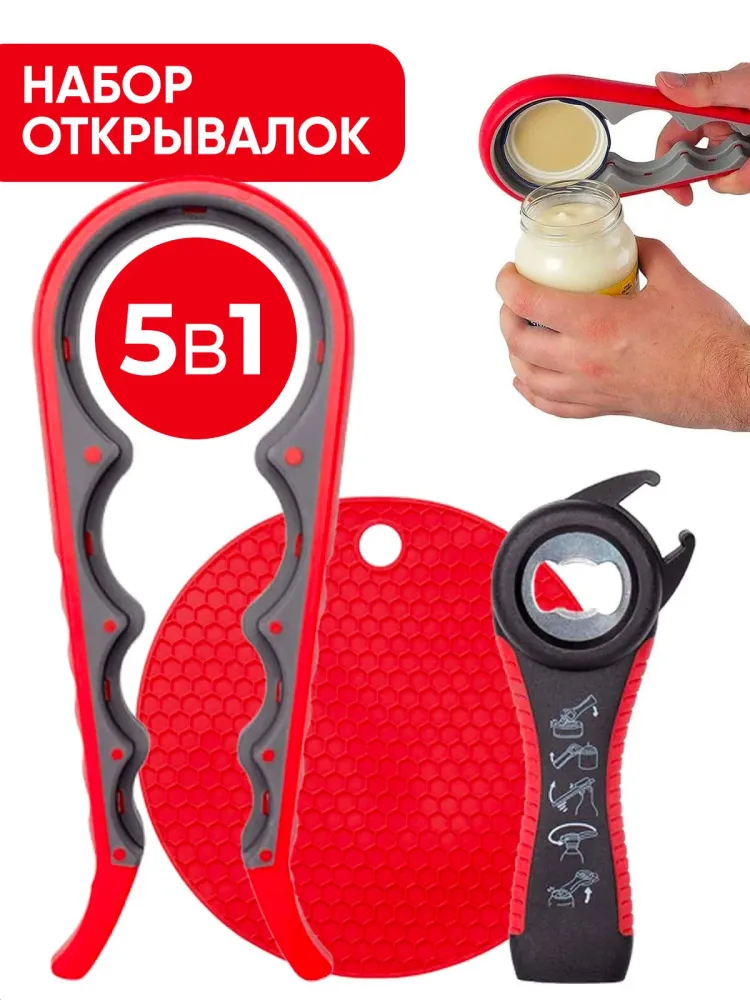 Наш кухонный набор из Открывашек облегчит жизнь всем: женщинам, детям, пожилым людям, людям с ограниченной или ослабленной подвижностью рук, а также людям с артритом. Всем, кто стремится сделать свою жизнь более комфортной. Это практичный инструмент, который может открывать многие виды бутылочных крышек. Вам не нужно перенапрягать руки, чтобы открыть крышку бутылки. Эта открывалка для крышек - незаменимый кухонный аксессуар, который решит почти все ваши проблемы с банками. В наборы открывалок входят открывалка для банок 4 в 1 и открывалка для бутылок 5 в 1. Обе они подходят для разных крышек и бутылок, многофункциональны и полезны. Так же в комплекте удобный силиконовый захват. ОТКРЫВАШКА ДЛЯ БАНОК: Этот прибор эргономичен и удобен в использовании благодаря 4 углублениям под крышки. Открывашка подходит для большинства крышек. Нескользящий пластик и силиконовое внутреннее покрытие помогают открывать даже самые неподатливые крышки банок и бутылок. ОТКРЫВАШКА ДЛЯ БУТЫЛОК: С этим прибором вы с легкостью откроете любу бутылку. Благодаря крючку вы сможете поддеть крышку банки, чтобы зашел воздух. СИЛИКОНОВЫЙ ЗАХВАТ: Нескользящая накладка обеспечивает превосходный захват при открывании труднодоступных банок и предотвращает скольжение предметов даже мокрыми руками. ЗАЩИТИТ ВАШИ СУСТАВЫ: Инструменты предназначены для маленьких рук, пожилых людей или тех, кто страдает артритом. Ручка с удобным захватом отлично подходит для банок, мокрых рук, людям с ограниченной подвижностью и травмами рук.