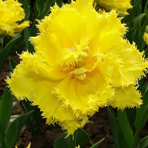 Размер луковицы 11-12 см Тюльпан Экзотик Сан (Exotic Sun). Класс - дабл-бахромчатый Тюльпан Экзотик Сан ярко-жёлтого цвета, с бахромой на краях цветка. По середине каждого лепестка проходит ровная, разделяющая на две части, зелёная линия. Сами лепестки в форме копья, заострены к вершине. Высота тюльпана Экзотик Сан достигает 35-50 см, плотный, с хорошо прилегающей к нему прикорневой листвой. Продолжительность цветения более 2х недель. Отлично смотрится в срезке и групповых посадках. Так что если в Вашем крае не хватает солнечных дней, то выбирайте тюльпан сорта Экзотик Сан и он подарит Вашему саду солнечный цвет.