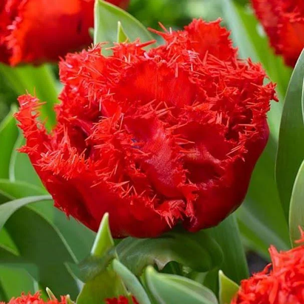 Цветет в конце мая, образуя насыщенный карминно-красный цветок, с красивой и изящной бахромой на кончиках лепестков, высота бокала 7-8 см ,диаметр 9-15 см. Отличительная особенность этих тюльпанов - игольчатая бахрома по краям лепестков, напоминающая иней. Высота 50 см. Легко размножается, дает прекрасную срезку.