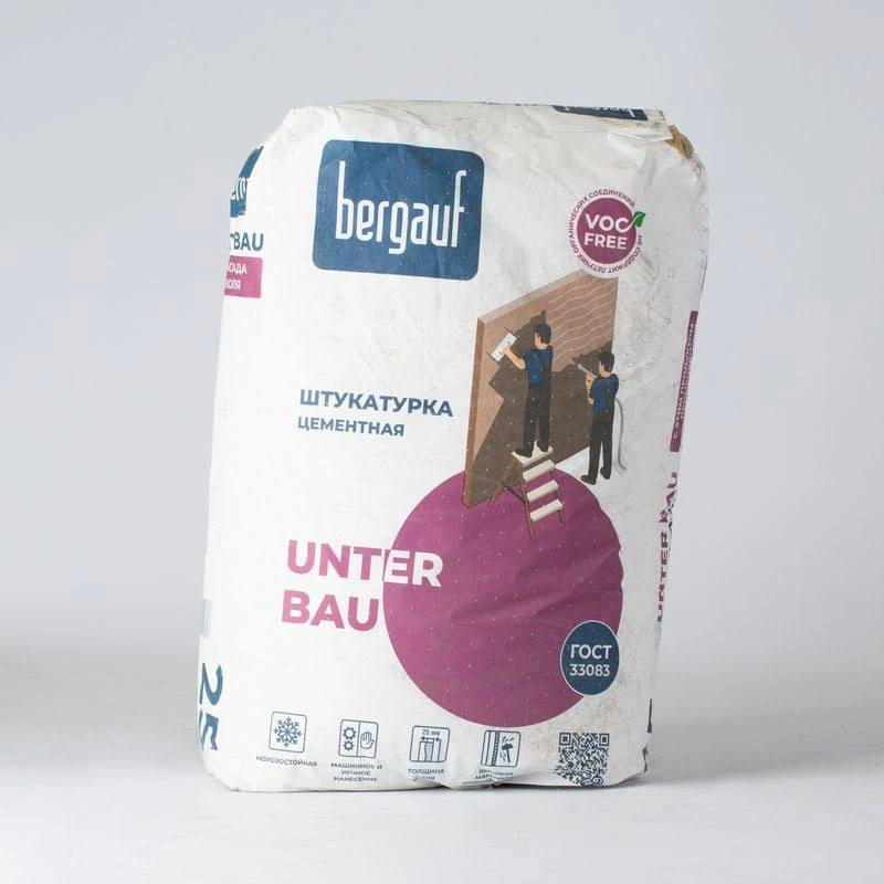 Штукатурка Bergauf Unter Bau, 25 кг Штукатурка на цементной основе для работы внутри и с наружи помещения. НАЗНАЧЕНИЕ: Выравнивание поверхности для дальнейшего нанесения декоративных покрытий Защита наружных стен зданий, цоколя от факторов окружающей среды Применение на кирпичных, цементных, известковых, бетонных основаниях различного вида. ПРЕИМУЩЕСТВА: Может использоваться и снаружи и внутри зданий Обладает водоотталкивающими свойствамиУстойчива к морозам (не более 50 циклов замораживания/оттаивания)Прочная (адгезия с основанием 0,4МПа). РЕКОМЕНДАЦИИ ПО ПРИМЕНЕНИЮ: Подготовка основания: Удалить с основания старую краску, жирные пятна, отслоения, пыль и иные загрязнения, которые могут уменьшить сцепление со штукатуркой Окна и двери должны быть закрыты, чтобы избежать сквозняковТемпературный режим в помещении должен быть не ниже +5°С и не выше + 25°С градусов. Это условие необходимо соблюдать за пять дней до работ и три дня послеПри работе на улице прямые солнечные лучи не должны попадать на поверхность и на нанесенную штукатурку. Максимальная температура воздуха +30°С градусов, основания для нанесения - +25°С градусов. Не проводить оштукатуривание при ветре свыше 10 м/с и атмосферных осадках Глубокие трещины и сколы, за сутки до начала основных работ, очистить от пыли, обработать составом грунтовочным составом, заполнить густой шпаклевочной смесьюПористые и сильно впитывающие поверхности, например, ячеистый бетон, пеноблоки, предварительно обработать грунтовочным составом, просушить один час и обработать повторно. Сушить перед нанесением штукатурки 4 часа. Приготовление смеси: Емкость, в которой будут замешивать раствор, и инструменты должны быть чистыми и сухимиНе переставая перемешивать, в воду (температурой от +5 до +25 градусов) постепенно ввести сухую смесь в следующих пропорциях: - на 1 кг смеси – 0,2 – 0,23 л воды - на 25 кг смеси – 5 – 5,75 л воды Если предполагается нанесение толстого слоя штукатурки, то разводить минимальным количеством водыЗамешивать при помощи строительного миксера на низких оборотах (не более 800 в минуту). Смесь должна стать однородной. Дать отстояться в течение пяти минут и снова замешать. Замешанный раствор пригоден для работы 3 часаПри машинном нанесении сухую смесь засыпать в бак, установить начальный расход воды, довести раствор до нужной густоты, регулируя расход воды. В неподвижном состоянии раствор может находиться в машине не более часа. Нанесение: Смесь набросать, используя железный шпатель, кельму или ковш, между установленными ранее маяками на 1-3 мм выше. Маяки крепить к основанию на быстротвердеющий цементный составРазровнять смесь h-образным правилом, ведя им по направлению «снизу вверх», прижав к маякам под углом 60 градусов. Оставшуюся на правиле смесь можно использовать для дальнейшей работыЧерез 1,5-2 часа смесь станет неподвижной. Ее нужно подрезать правилом трапеция, ведя им «снизу вверх», прижав к маякам. Остатки затвердевшей смеси для дальнейшей работы непригодны Для приклеивания обоев напрямую на данное основание нужно смочить его водой и заглянцевать жестким железным шпателемСостав твердеет 3-7 дней, на этот период нужно исключить воздействия на него сквозняков, осадков, прямых лучей солнцаНаносить шпаклевку и клеить плитку можно спустя 3 суток. Красить и клеить обои через 14 суток. ОБЩ