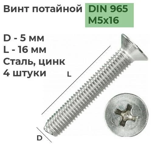 Винт с потайной головкой с крестообразным шлицем и полной резьбой (метрической стандартного шага, нарезанной по всей длине шпильки). ВинтыDIN965используются в строительстве, машиностроении, промышленных и производственных отраслях совместно с шайбами, гайками соответствующих размеров. Покрытие белый цинк.